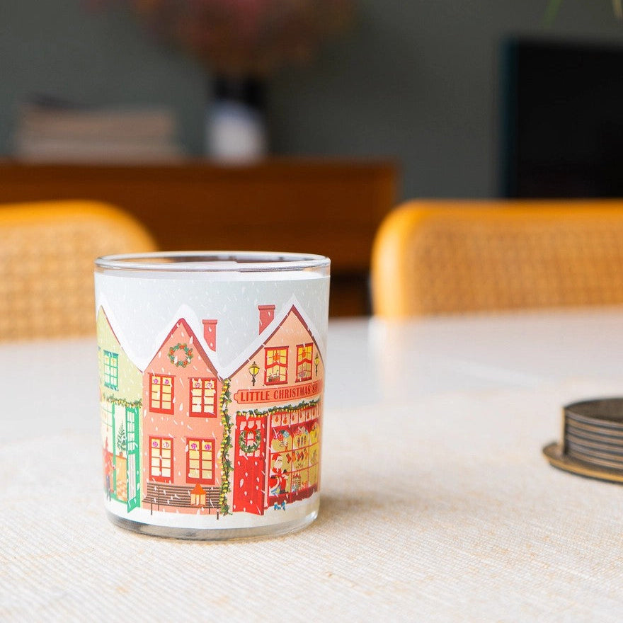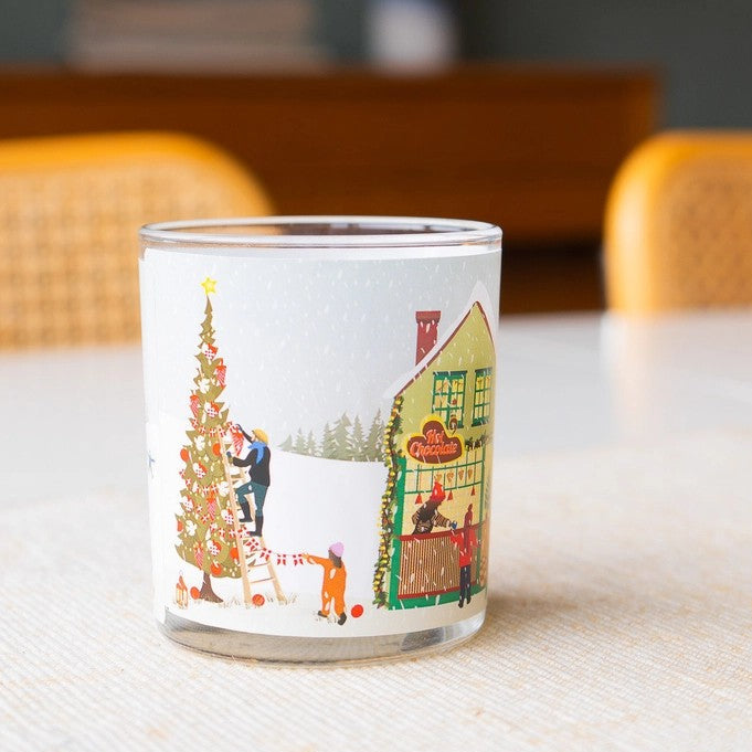 Julelys i glass som er vakkert illustrert med en julelandsby i Vissevasses karakteristiske stil.