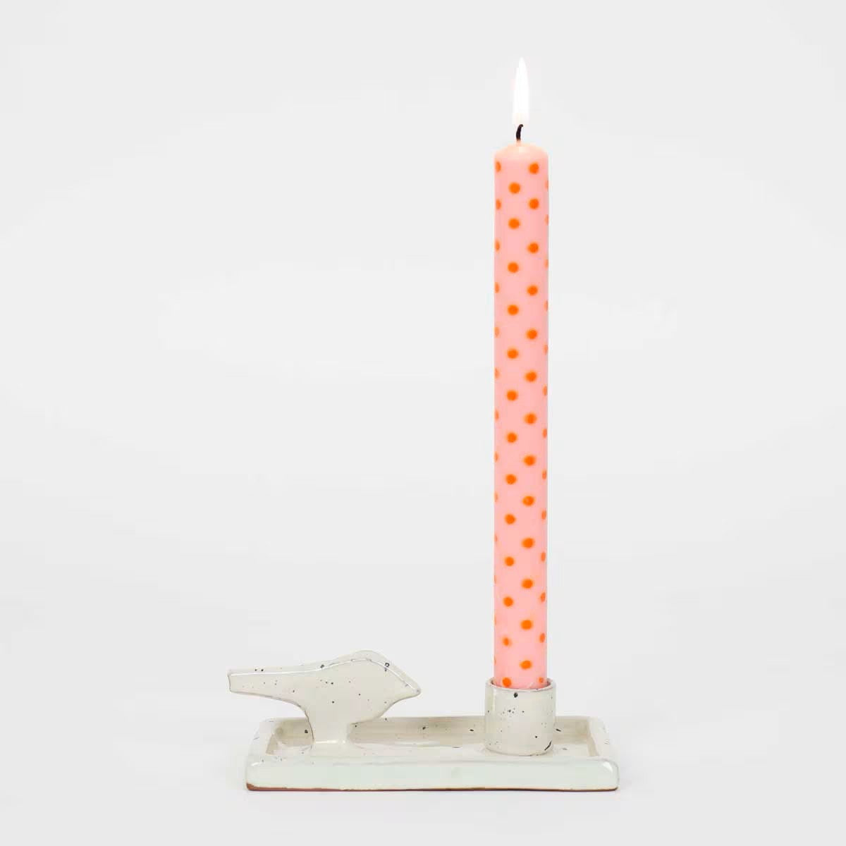 Håndlaget lysestake med søt fugl i glasert steingods.